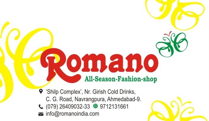 WELCOME TO www.romanoindia.com :: We Are :: ROMANO Shilp Complex, Near Girish Cold Drinks,C.G.Road, Ahmedabad - 380009 Gujarat - INDIA :: For Quick Contact Mail Us :: info@romanoindia.com Mo. : 9712 131661